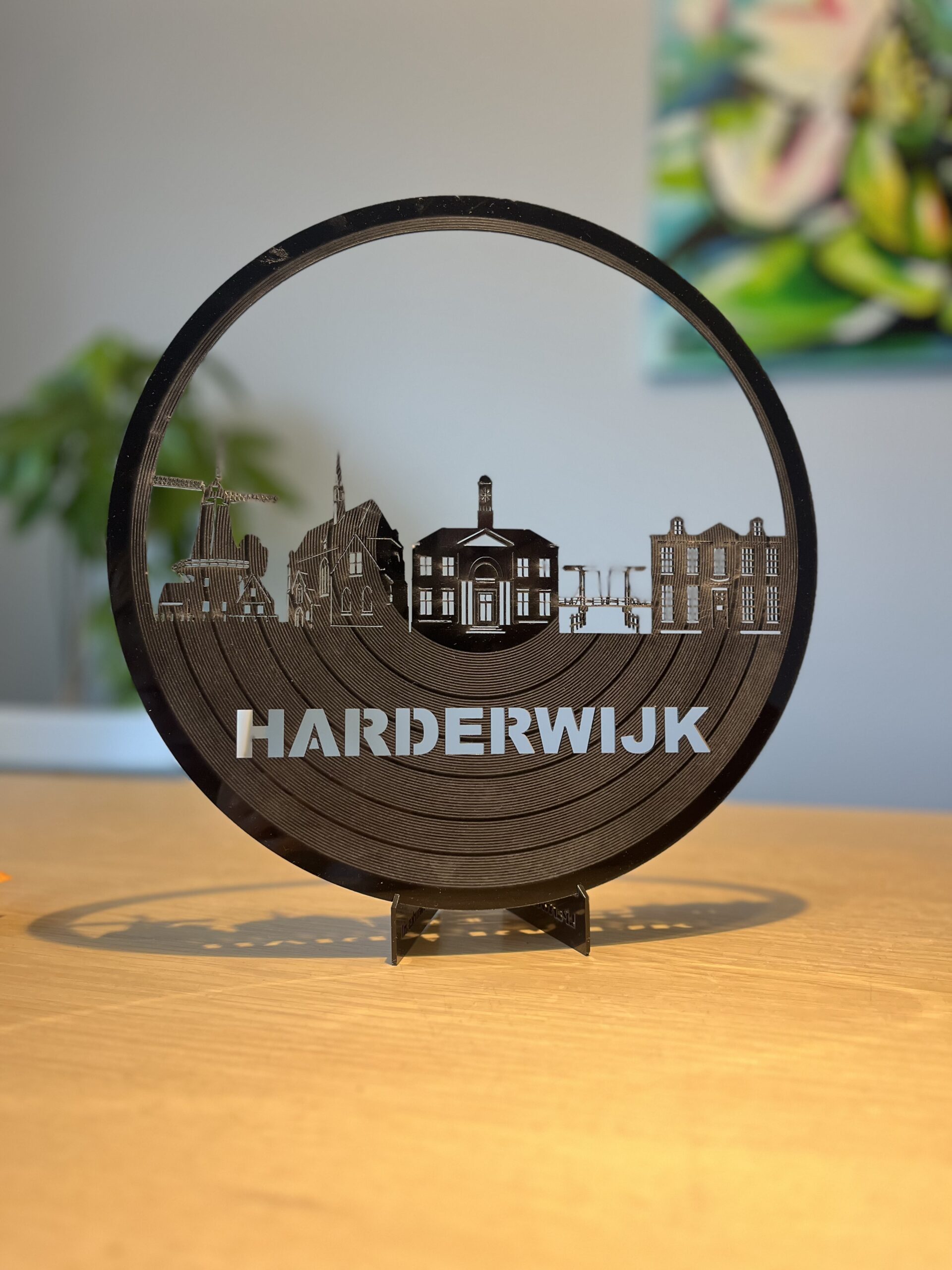 Deze skyline brengt de meest herkenbare plekken van de stad samen in één stijlvol silhouet. Uitgevoerd in een ronde vorm met groeven die doet denken aan een klassieke muziekplaat (LP) – een prachtige blikvanger voor aan de muur, op de kast of voor het raam.