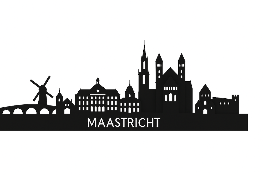 Deze kunstzinnige weergave toont de rijke historie en het karakteristieke stadsbeeld van Maastricht in één krachtig silhouet.