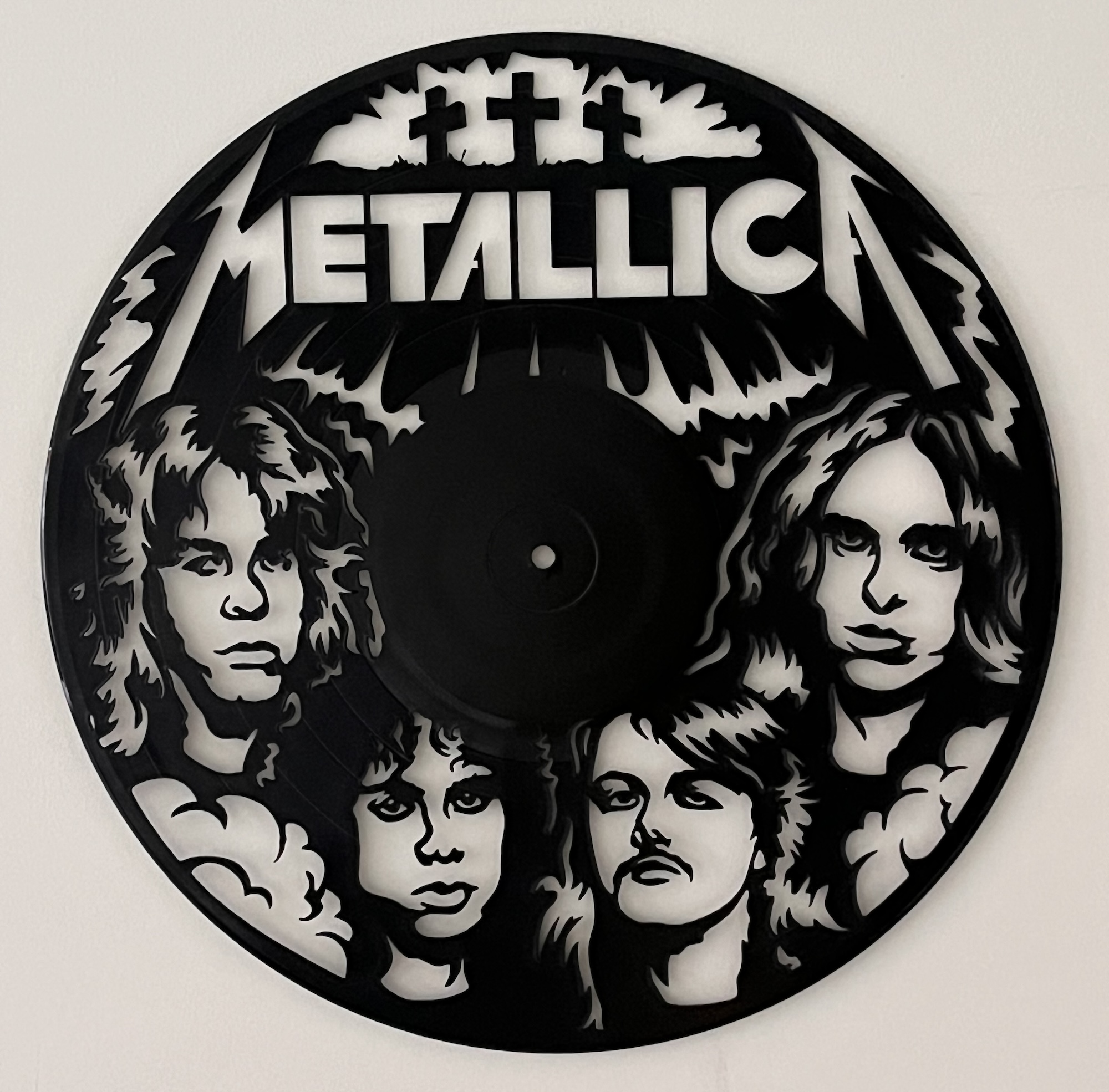 Een krachtig silhouetportret van Metallica, strak uitgesneden uit zwart acrylaat en uitgevoerd in de iconische vorm van een oude LP.