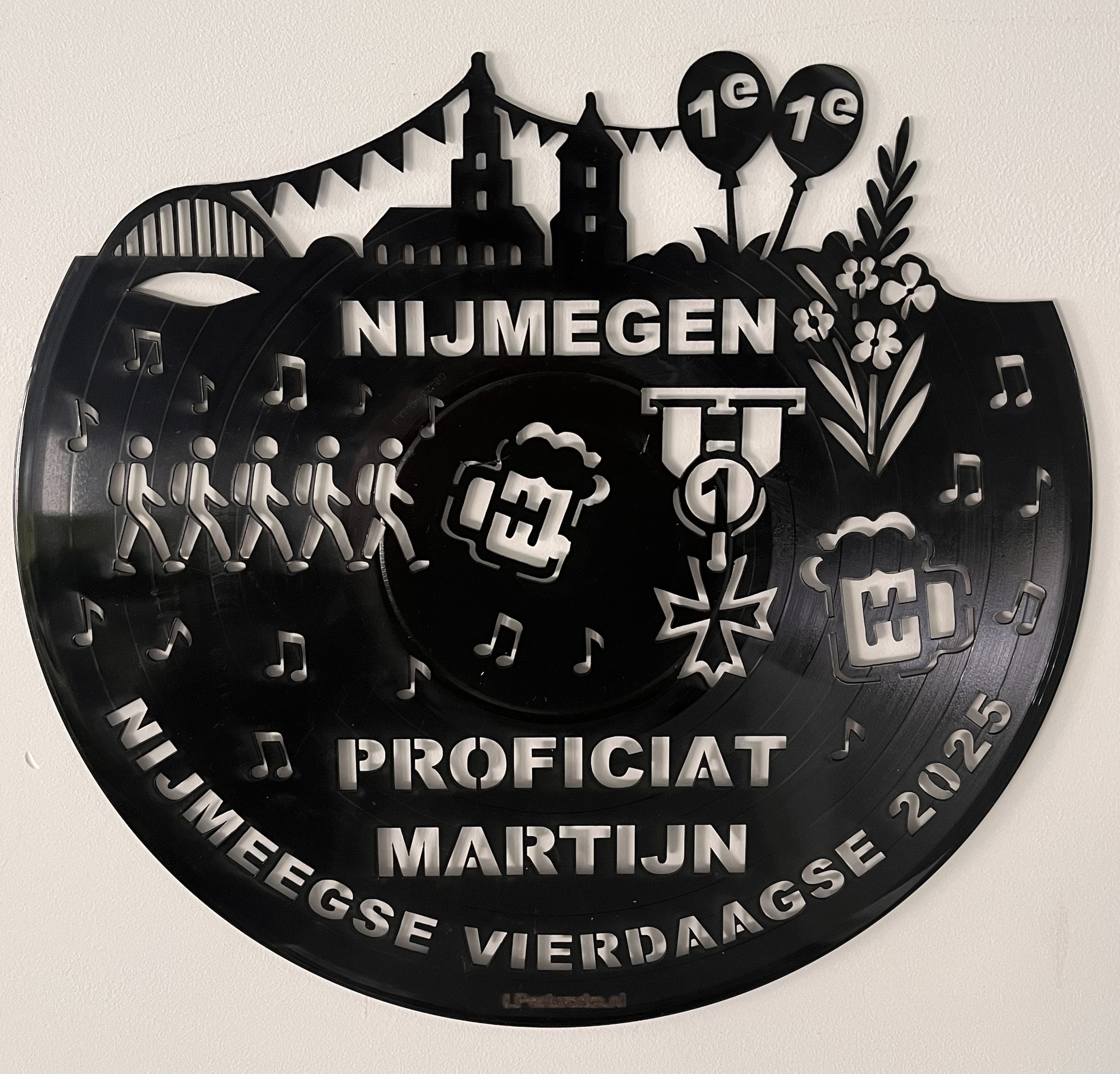 Een stijlvol en persoonlijk cadeau, gelaserd uit zwart acrylaat in de ronde vorm van een oude LP — een knipoog naar het verleden én een blijvende herinnering aan 2025.