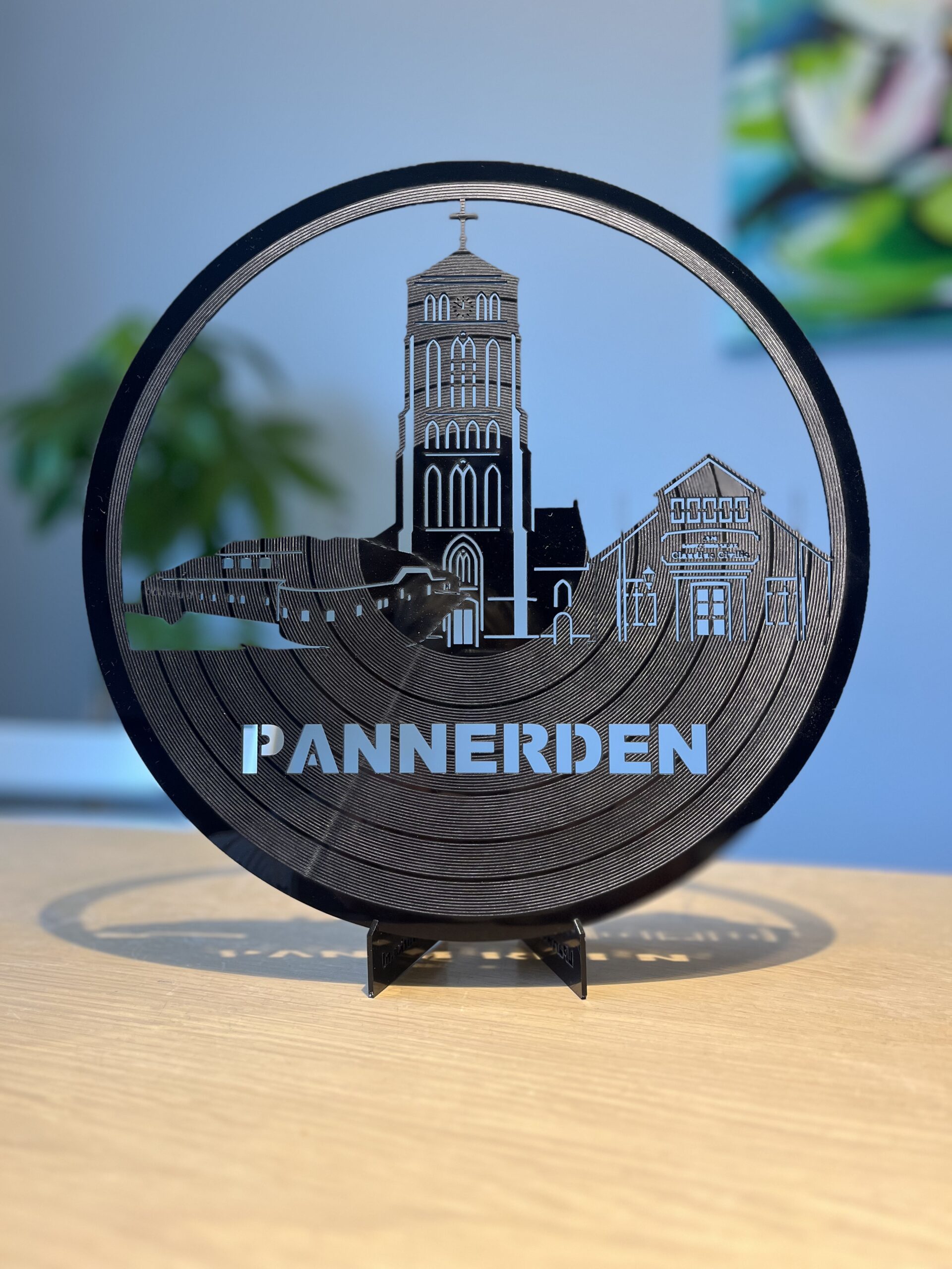 Deze skyline vangt drie markante plekken van het dorp in één stijlvol kunstwerk. Uitgevoerd in een ronde vorm met groeven die doet denken aan een klassieke muziekplaat (LP) – een prachtige blikvanger voor aan de muur, op de kast of voor het raam.